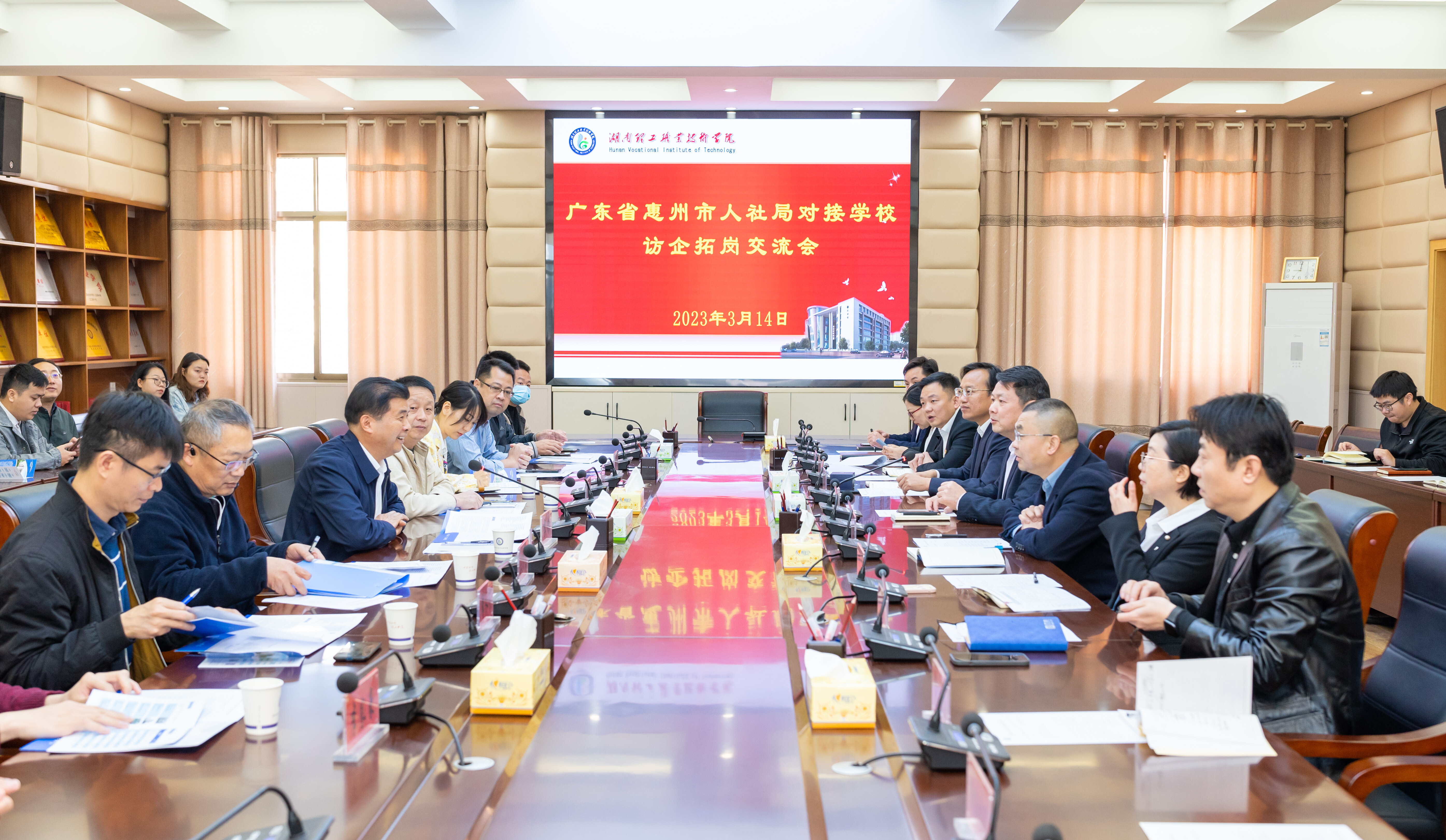 3月14日上午,在湖南理工職業工程學院參加廣東省惠州市人社局對接學校訪企拓崗交流會。座談會現場氣氛活躍、熱烈,參會企業和校方進行深入交流,學院介紹了五年來的建設情況和學院的專業分布情況以及就業情況。