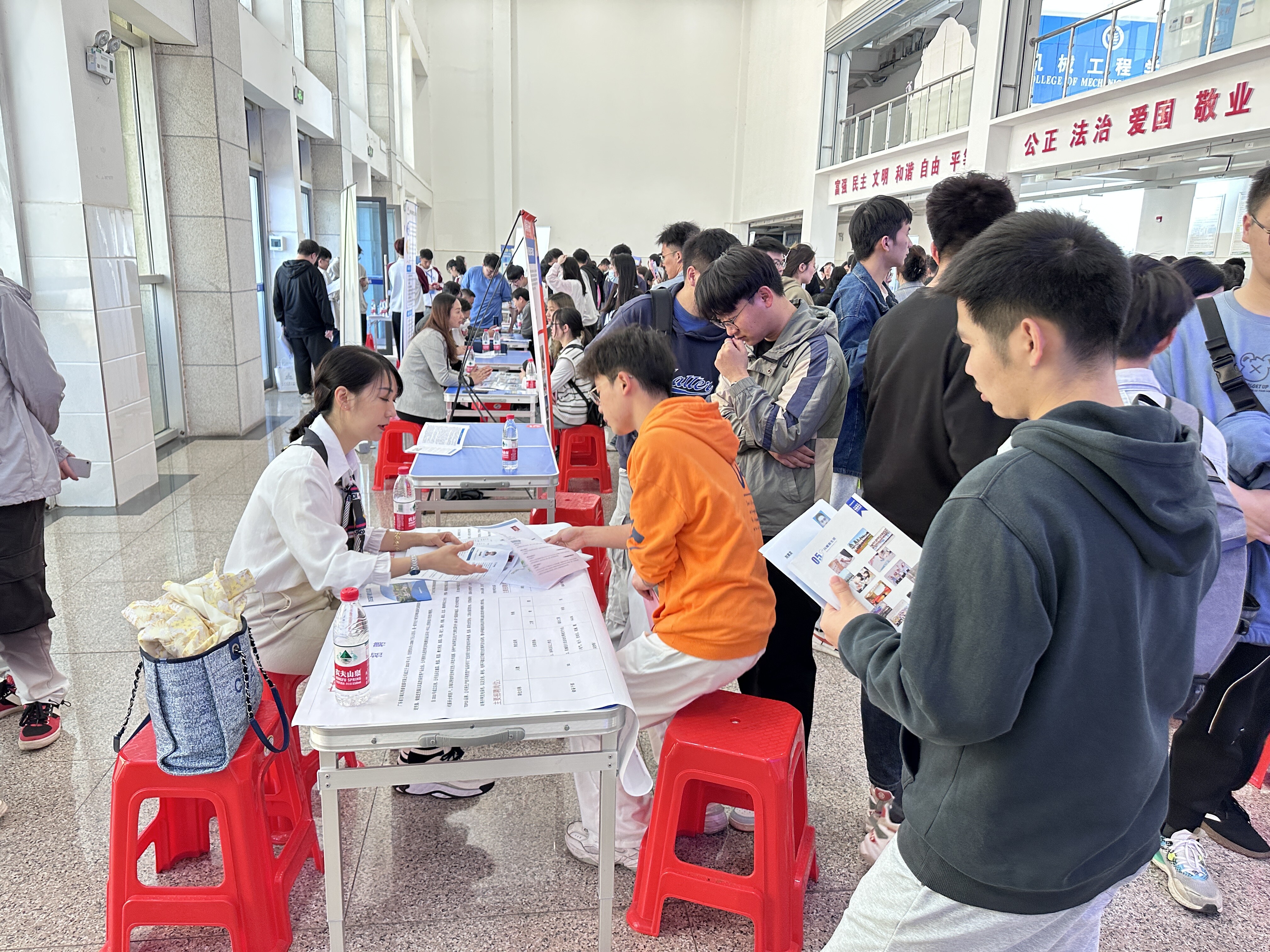 招聘會現場人山人海,氣氛火爆,學生們積極主動向心儀的企業了解情況;招聘人員通過發放宣傳頁、張貼海報、熱心接受咨詢等形式向畢業生展示企業規模、企業文化、薪資福利及發展前景等。