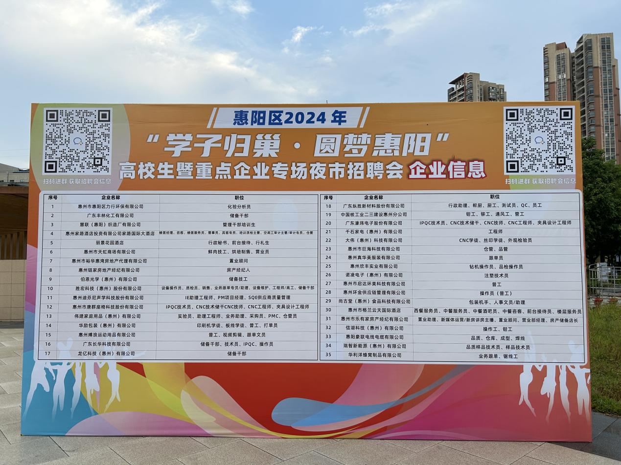 為深入學(xué)習(xí)貫徹黨的二十大精神,落實(shí)省委“1310”具體部署,持續(xù)推進(jìn)廣東青年下鄉(xiāng)返鄉(xiāng)興鄉(xiāng),助力“百縣千鎮(zhèn)萬(wàn)村高質(zhì)量發(fā)展工程”三年行動(dòng),促進(jìn)我區(qū)高校畢業(yè)生盡快就業(yè),8月5日晚,惠陽(yáng)區(qū)人社局聯(lián)合團(tuán)區(qū)委開(kāi)展惠陽(yáng)區(qū)2024年“學(xué)子歸巢?圓夢(mèng)惠陽(yáng)”高校生暨重點(diǎn)企業(yè)專場(chǎng)夜市招聘活動(dòng)。