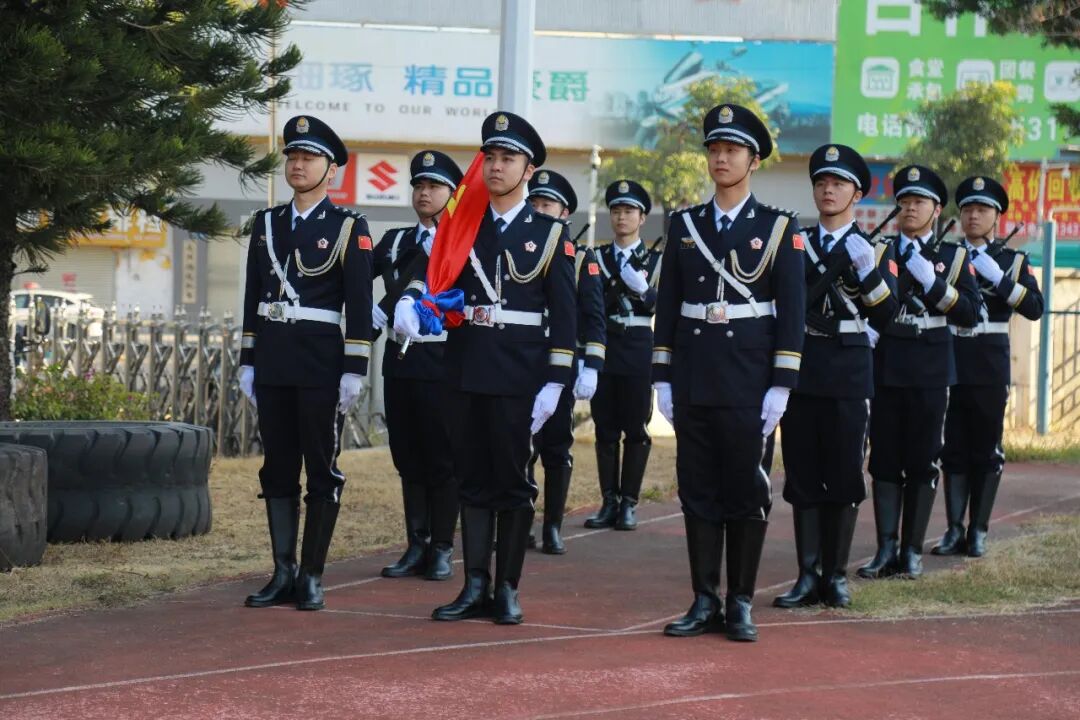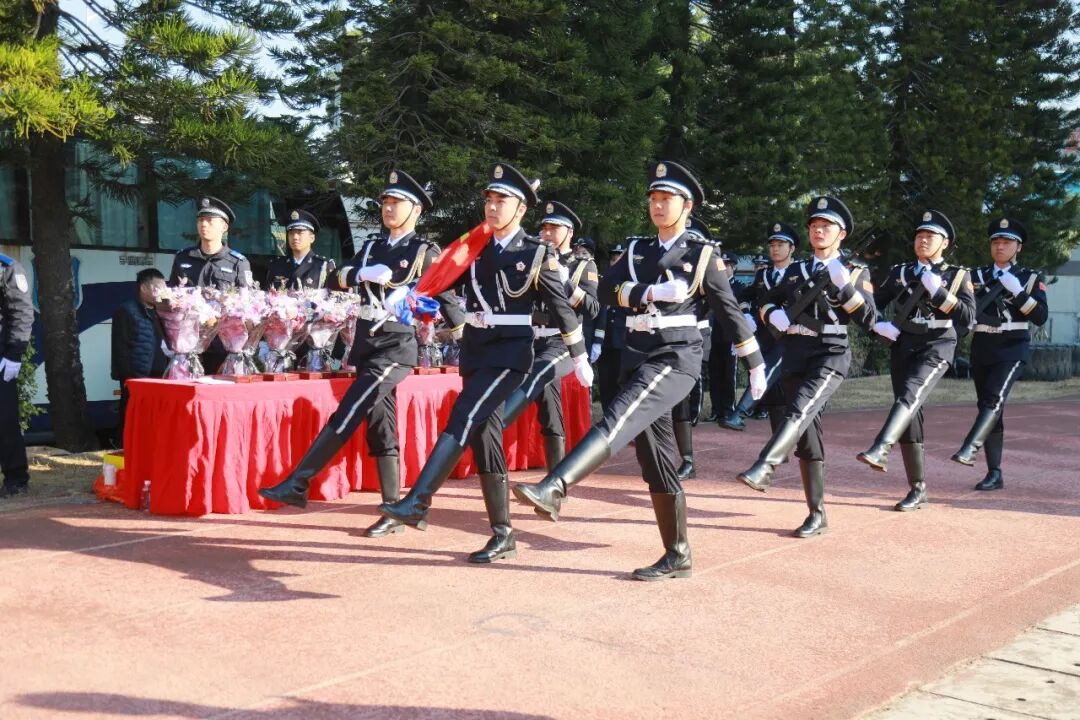 迎旗環節,儀仗隊員身著整齊制服,邁著鏗鏘有力的步伐,肩扛鮮艷的中國人民警察警旗,昂首挺胸走向升旗臺。他們的每一步都飽含著對使命的堅守,每一個姿態都彰顯著公安隊伍的昂揚斗志,全場人員目光緊隨警旗,滿含崇敬與自豪。