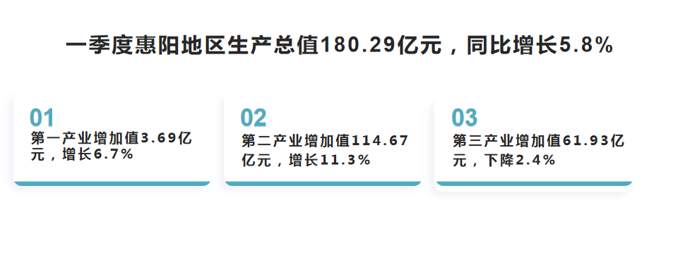 (一)經濟總量平穩增長。根據惠州市地區生產總值統一核算結果,2025年一季度,惠陽區地區生產總值180.29億元,按不變價格計算,同比增長5.8%。其中,第一產業增加值3.69億元,同比增長6.7%;第二產業增加值114.67億元,同比增長11.3%;第三產業增加值61.93億元,同比下降2.4%。